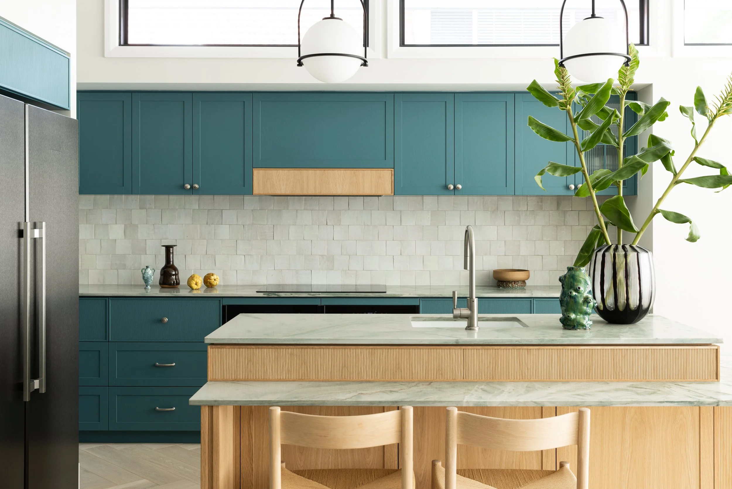 Our client, Justin, wanted a home that reflected his vibrant energy and love for innovation (and a good gadget). The spark for the design came in the most unexpected form, a marshmallow-pink resin cheese knife from Sardee that he produced during our first meeting, declaring, “Here’s your inspiration, now go for it.” From there, the vision took shape around soft pinks, rich burgundy tones, and integrated storage that feels both streamlined and striking.