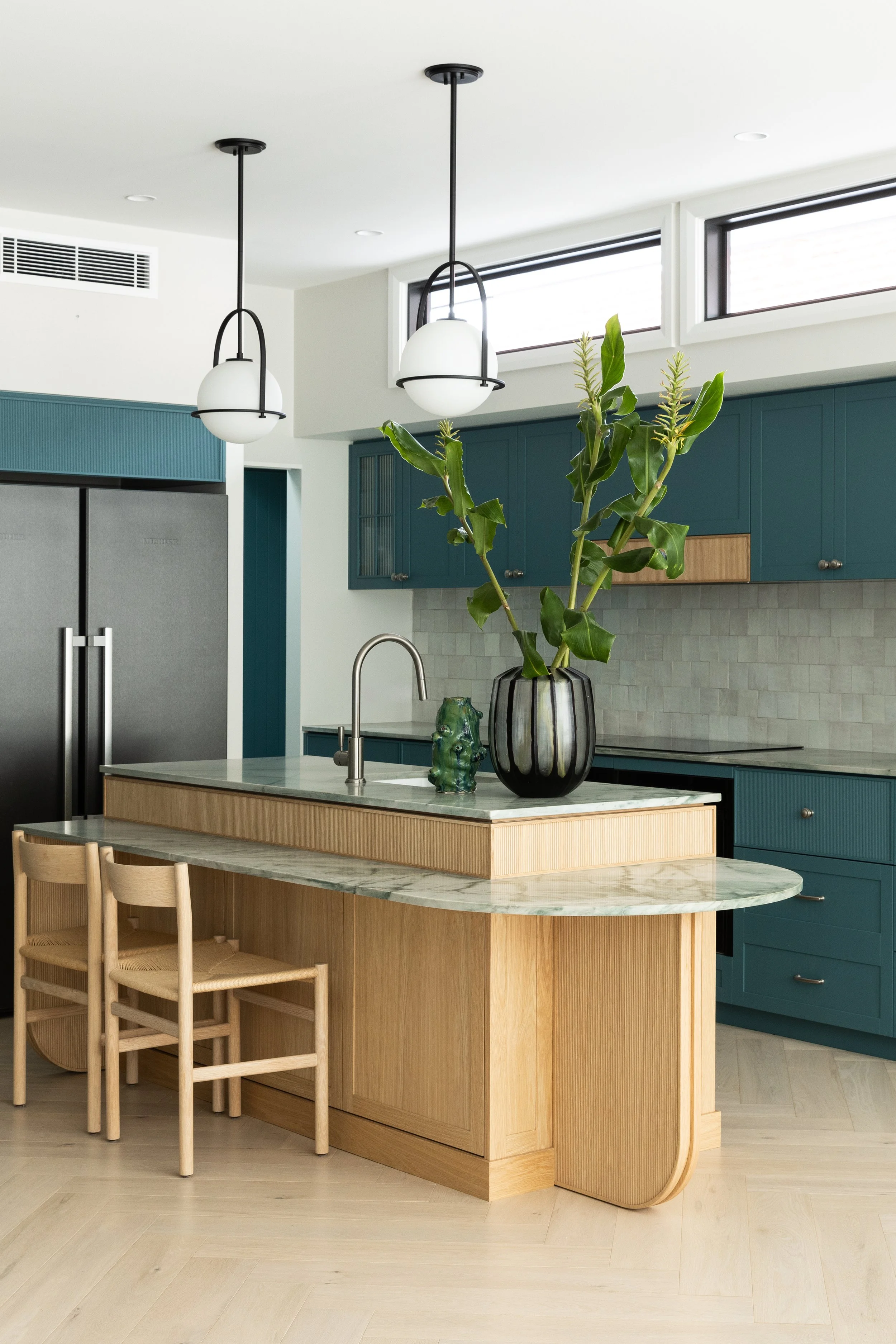 The design balances sophisticated fun with a calming ease. A restrained pink palette is elevated through thoughtful details: integrated handles, burgundy accents, and luxurious Kalamata joinery internals that add depth and contrast. Every element, from the flowing curves to the Invisacook cooktop, was chosen to create a seamless yet spirited space that reflects Justin’s character.